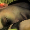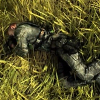 Description: A man lies on his side in the grass with half of his face obscured by his arm