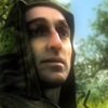 Description: A thin-faced man in hood stands in a bright clearing, looking surprised but happy